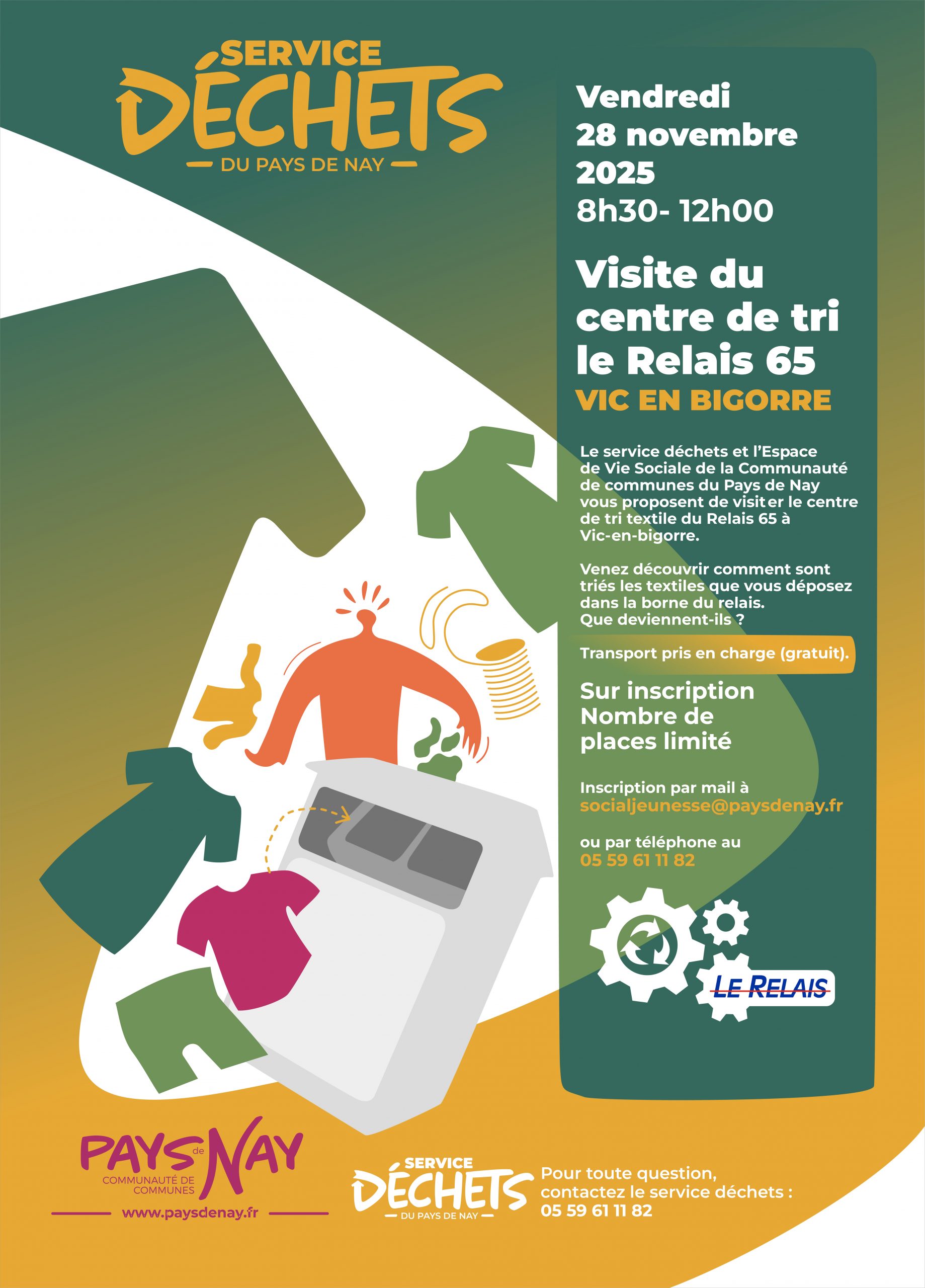 Le service déchets et l’espace de vie sociale de la communauté de communes du pays de Nay vous proposent de venir découvrir ce que deviennent les textiles que vous mettez dans la borne du Relais 64.